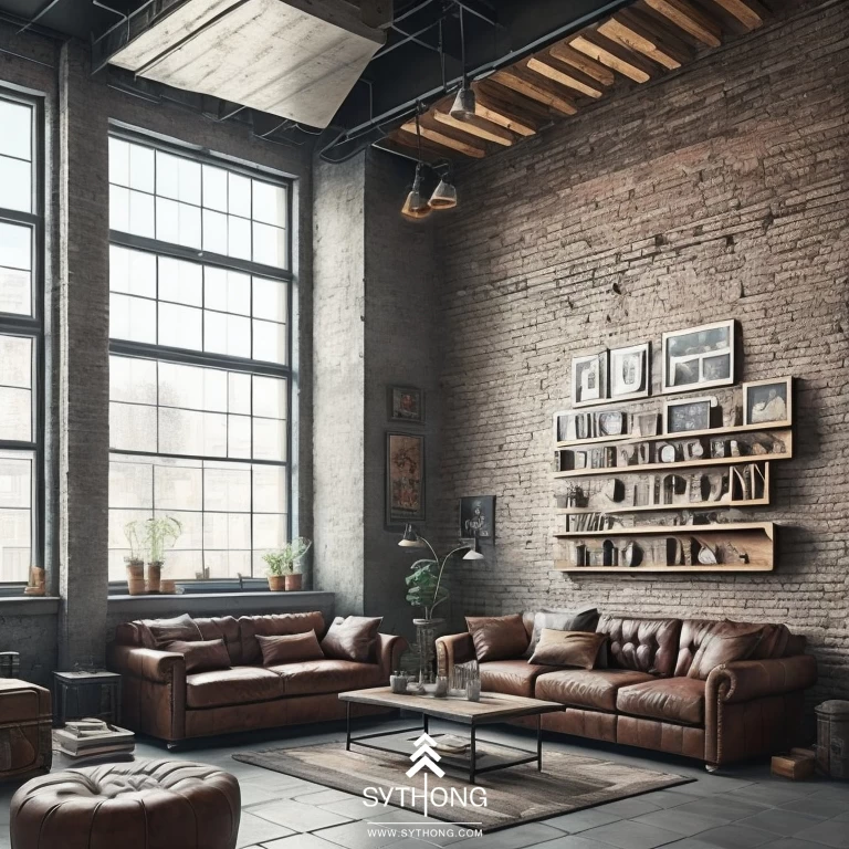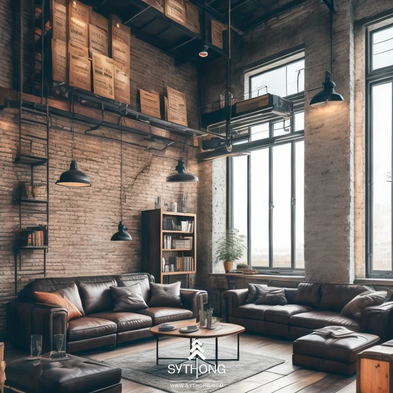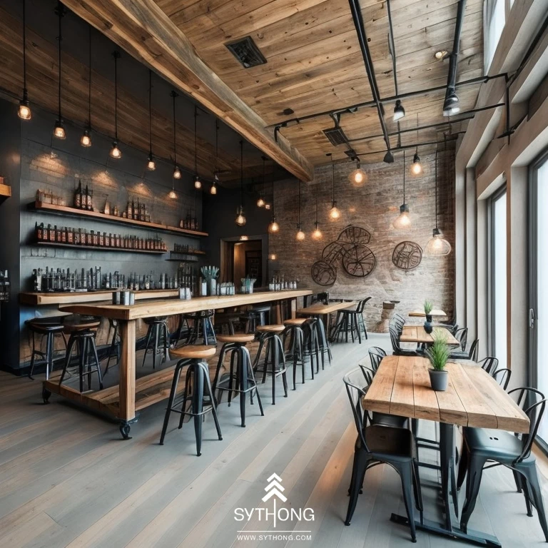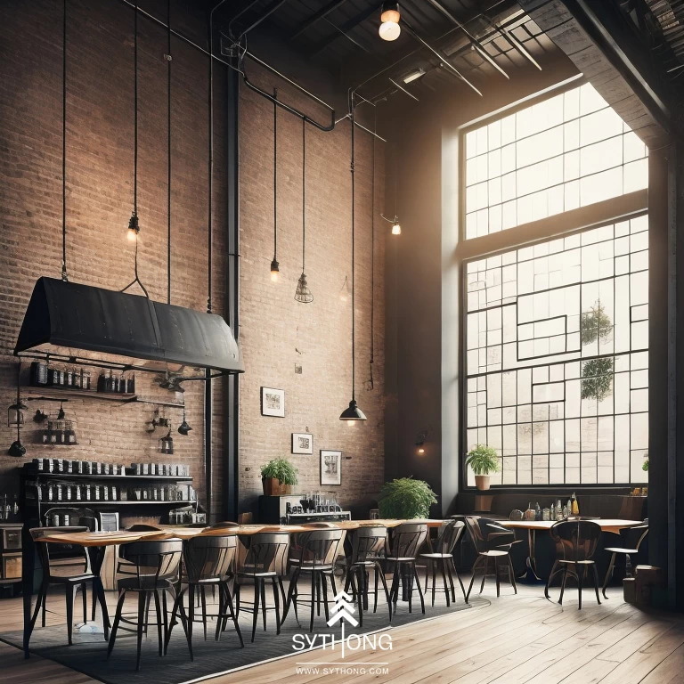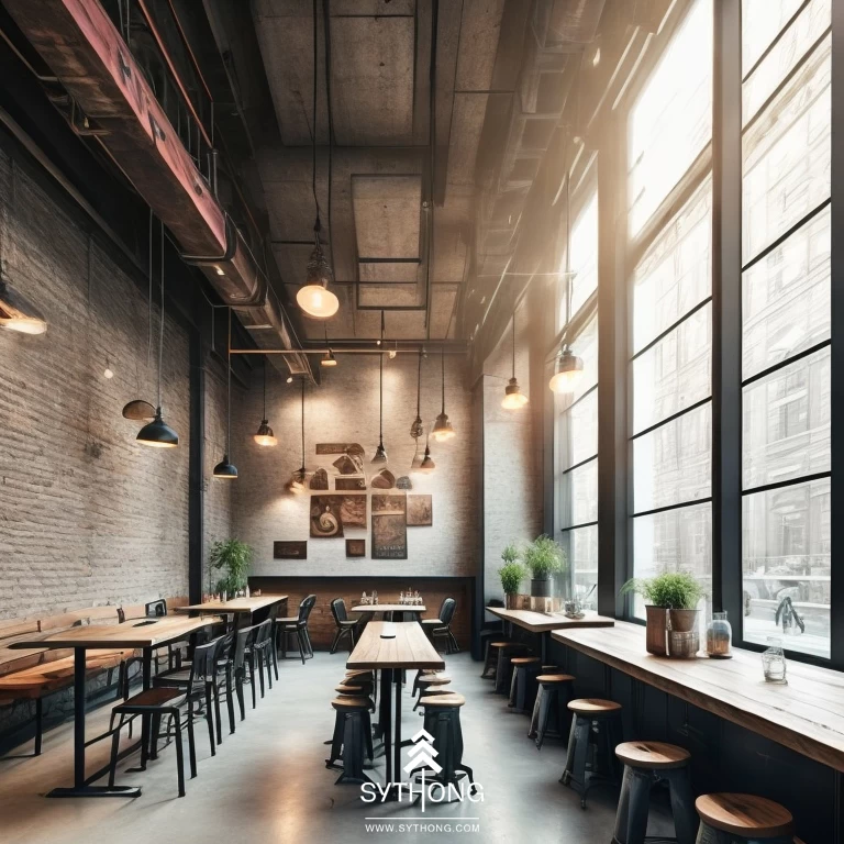 Quán cà phê phong cách công nghiệp (industrial) thường được thiết kế với các chi tiết gỗ, kim loại và bê tông, tạo cảm giác "cứng cáp", "mạnh mẽ". Nội thất của quán được bố trí đơn giản, sử dụng chủ yếu màu sắc đen, trắng, xám và nâu, tạo cảm giác ấm áp, gần gũi và thân thiện với khách hàng khi trải nghiệm không gian của quán.Các bức tường bê tông, gạch thô hoặc gỗ mộc, các ống đồng hoặc thép được dùng làm trang trí và tạo nên không gian cực kỳ độc đáo, ấn tượng.
